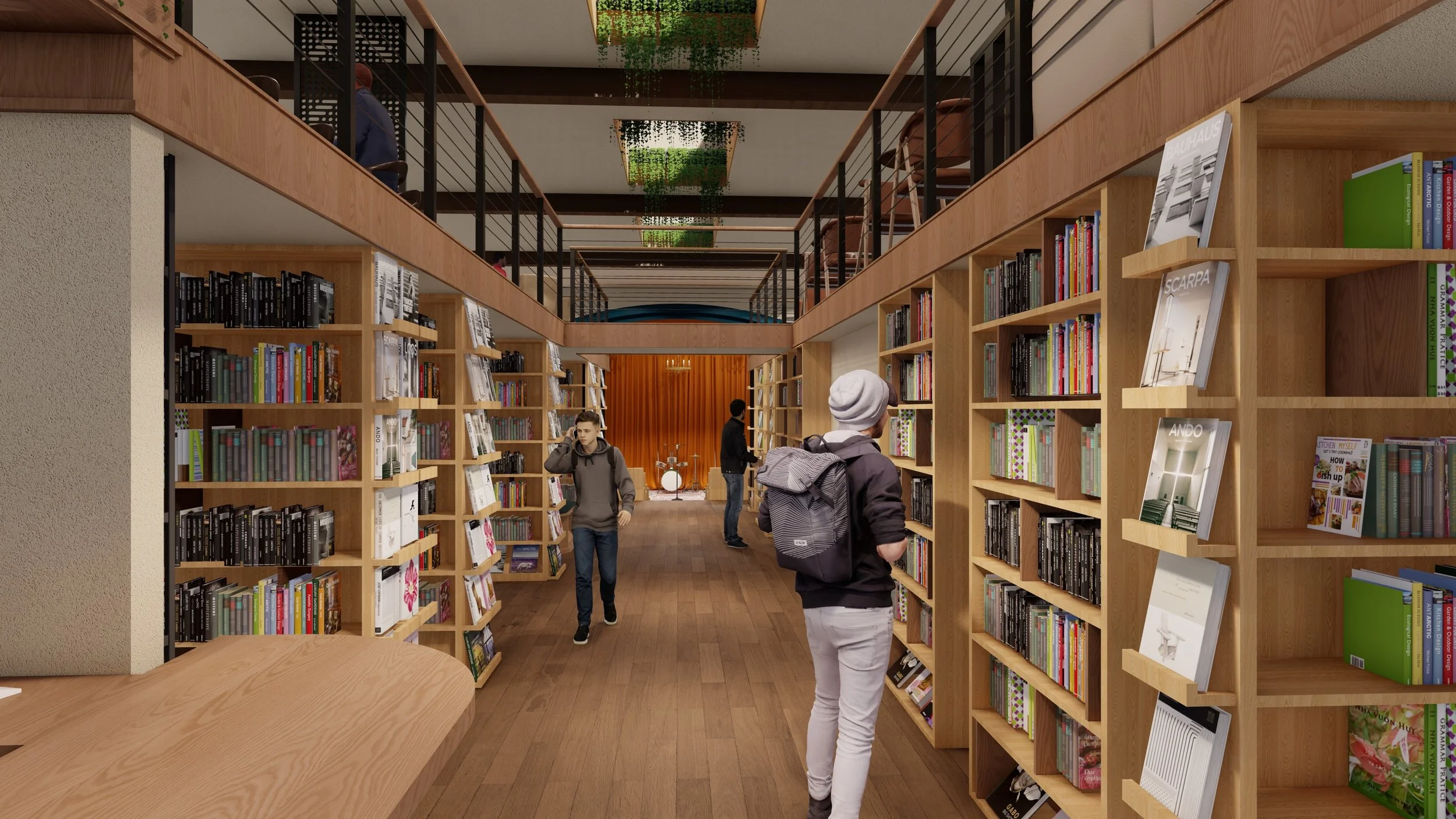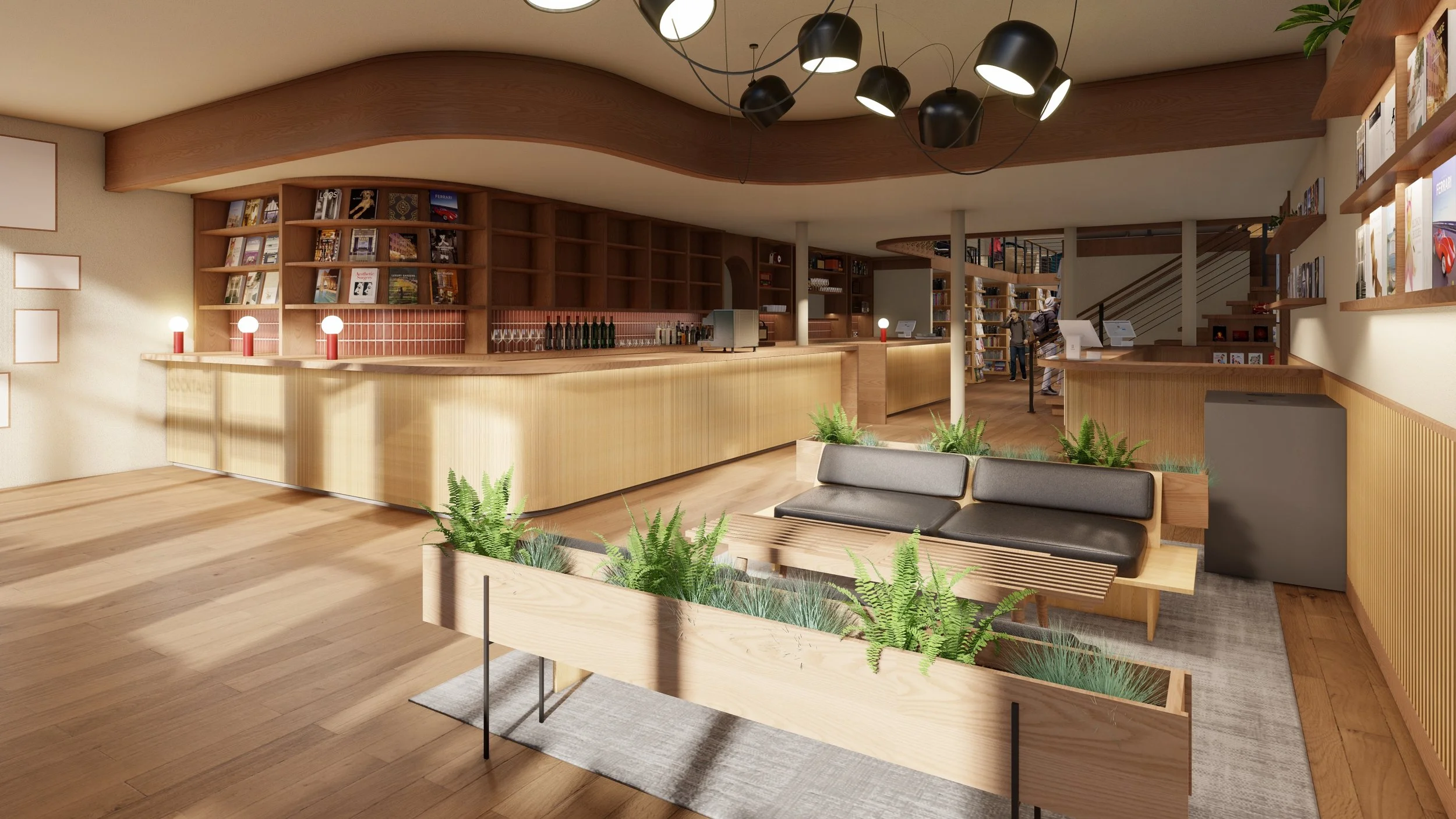 Allow for a warmly lit, comfortable mezzanine area conducive to relaxing, working, studying, or diving into a book you just found on the expanded shelves while enjoying food and beverages